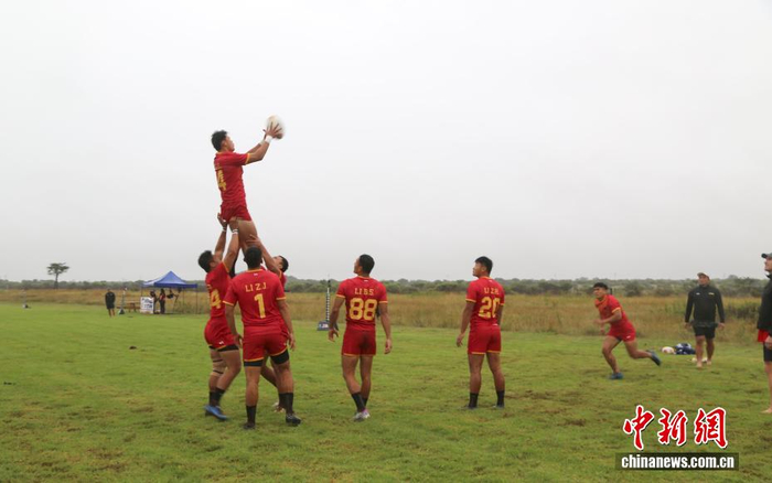 当地时间3月15日,中国七人制男子橄榄球队在南非林波波省莫迪莫勒与多只当地球队进行交流赛。图为中国队球员练习技战术配合。中新社记者 孙翔 摄