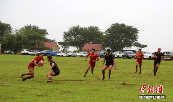 当地时间3月15日,中国七人制男子橄榄球队在南非林波波省莫迪莫勒与多只当地球队进行交流赛。图为中国队球员练习技战术配合。中新社记者 孙翔 摄