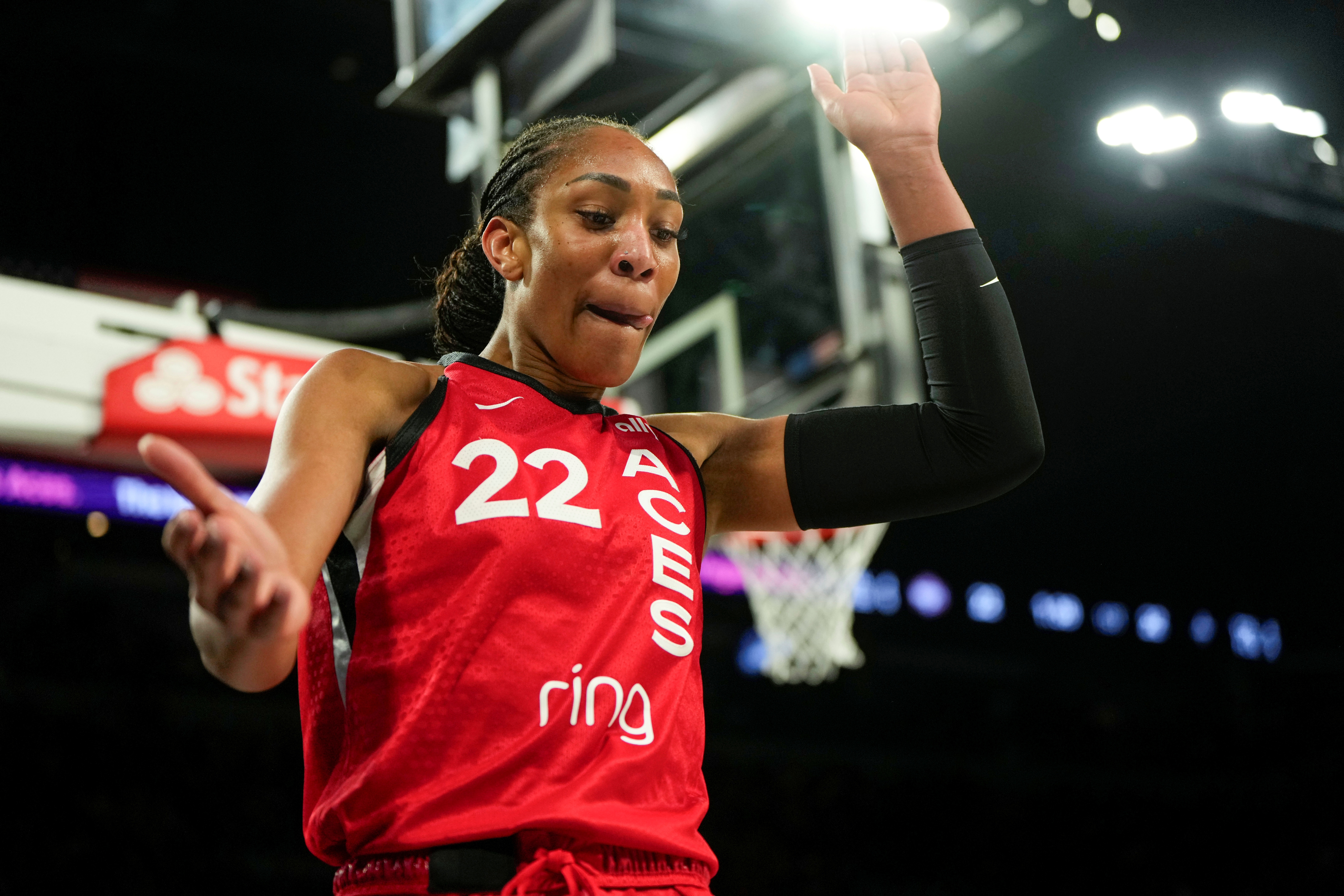 本场比赛,王牌球星阿贾-威尔逊出战34分钟,投篮16中8,三分0出手,罚球15中14,砍下30分16篮板(5前场)1助攻2盖帽。